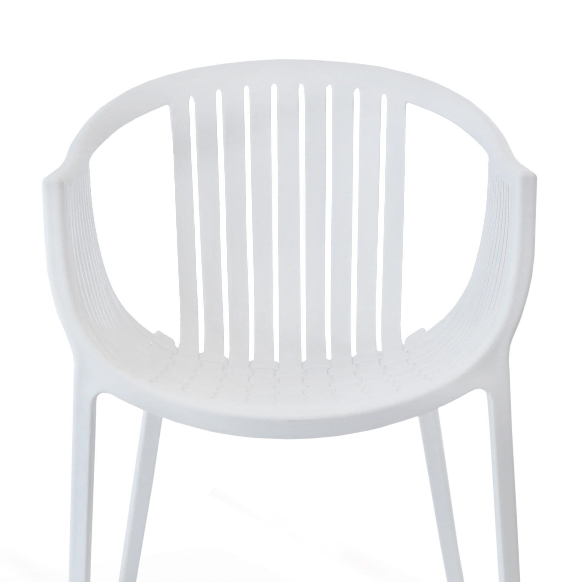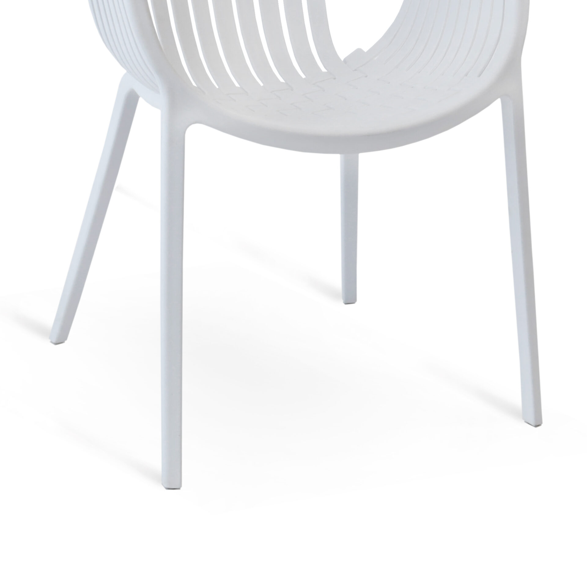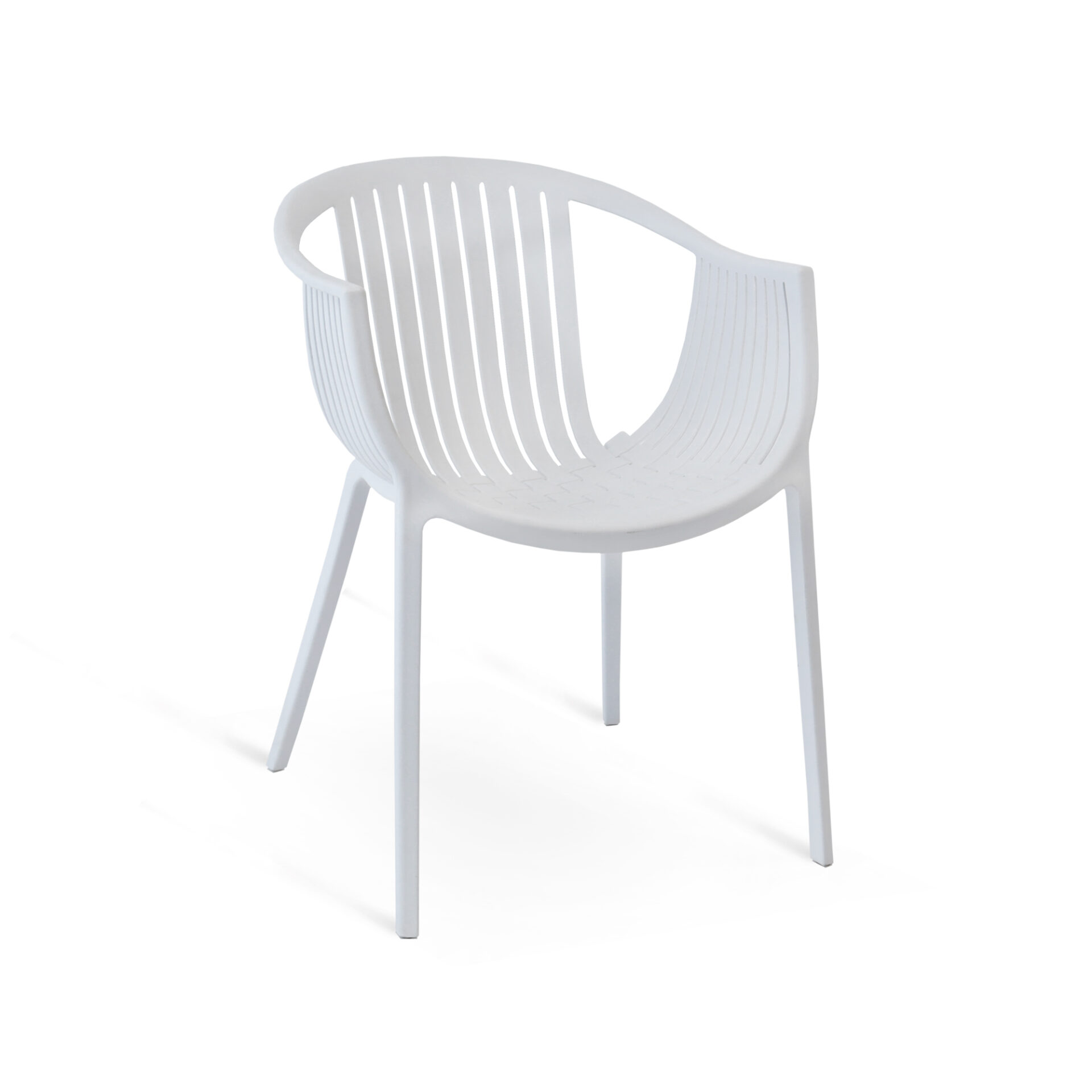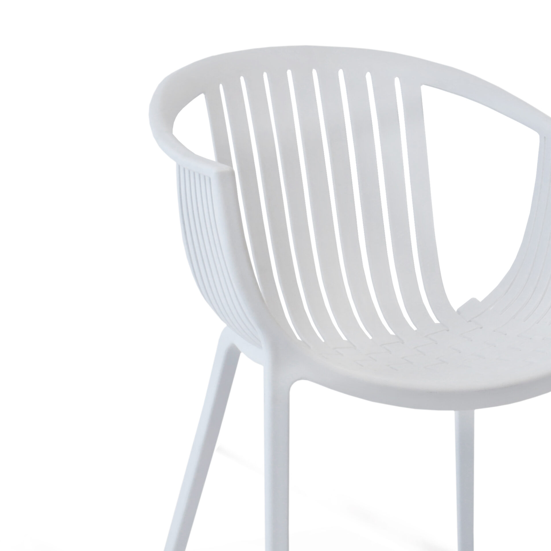 Sedia in polipropilene con struttura intrecciata e braccioli.