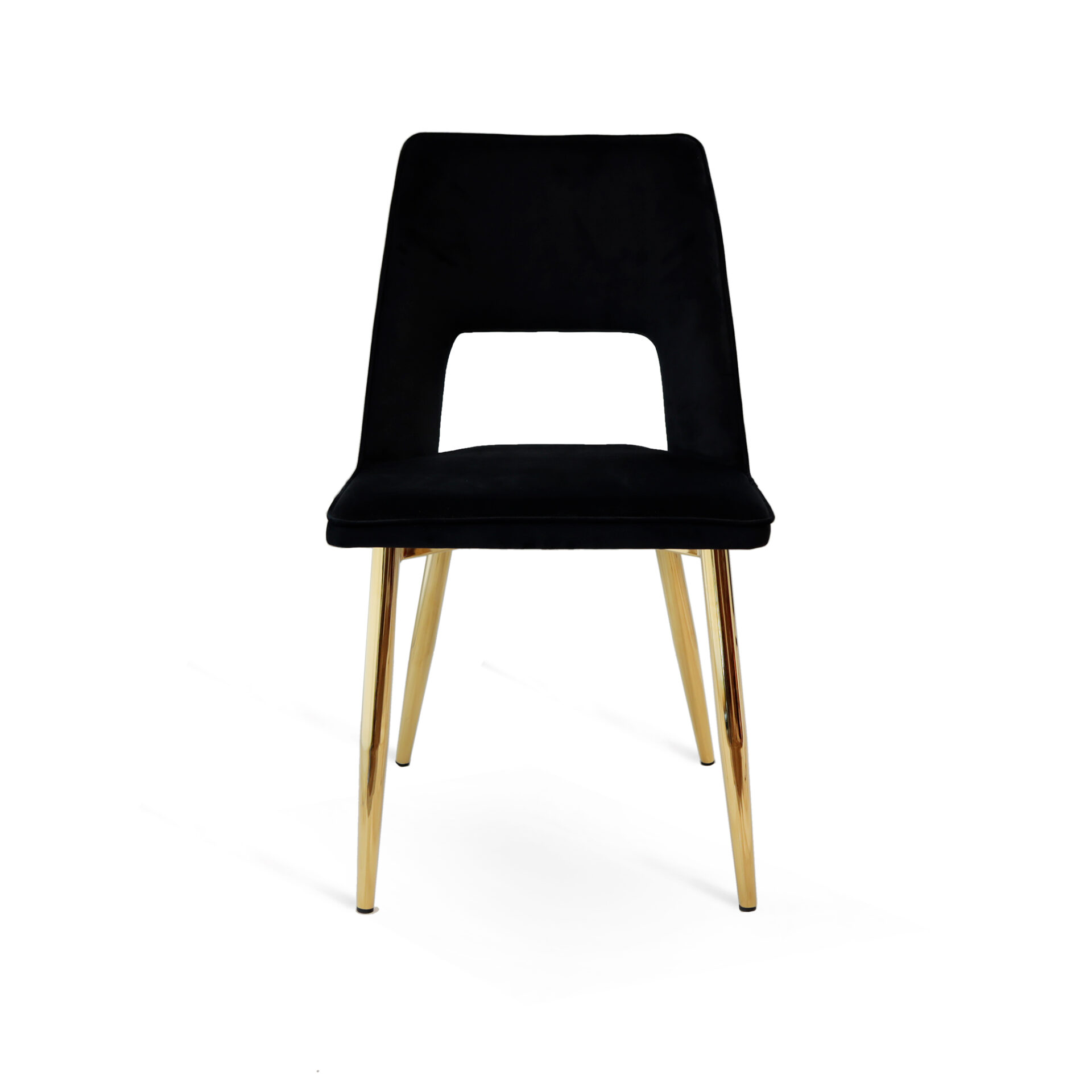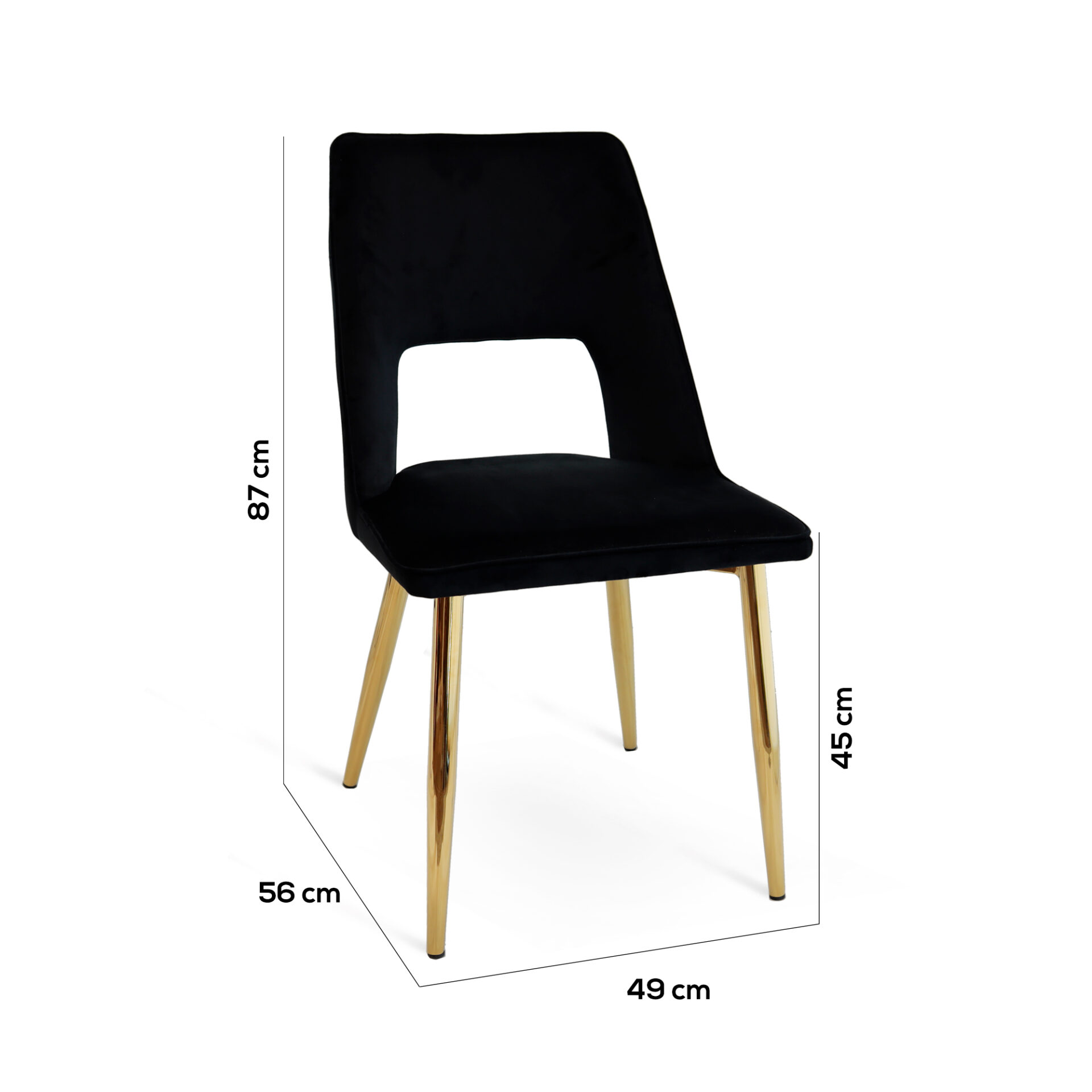 Sedia con struttura in metallo finitura oro lucido e seduta e schienali imbottiti in poliuretano e rivestiti in velluto nero.Dimensioni: