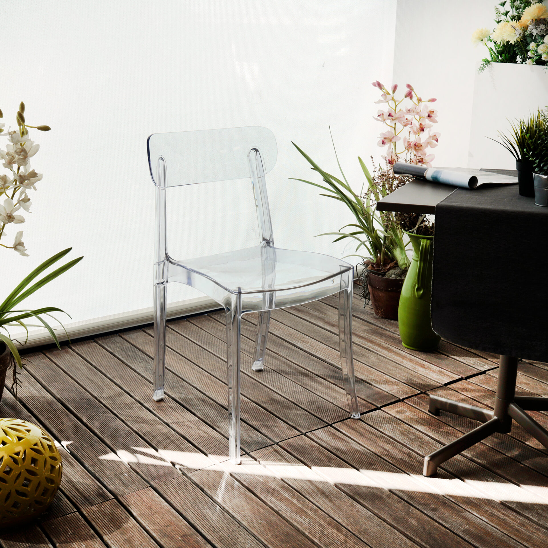 Grace è una sedia minimal dal design tradizionale, ma resa contemporanea e attuale dal materiale di cui è composta. Il suo stile moderno e la trasparenza consente di collocarla in ogni ambiente, sia dall’arredo classico sia dall’arredo moderno. Leggera e resistente agli urti, inoltre facile da pulire, sono le caratteristiche che la rendono perfetta anche per l’esterno. Le gambe affusolate sorreggono la seduta rettangolare e lo schienale, entrambi leggermente inclinati, le linee sobrie e la trasparenza sono peculiarità che la rendono un oggetto di design ideale per arredare ogni ambiente, dalla sala da pranzo, alle sale d’attesa.