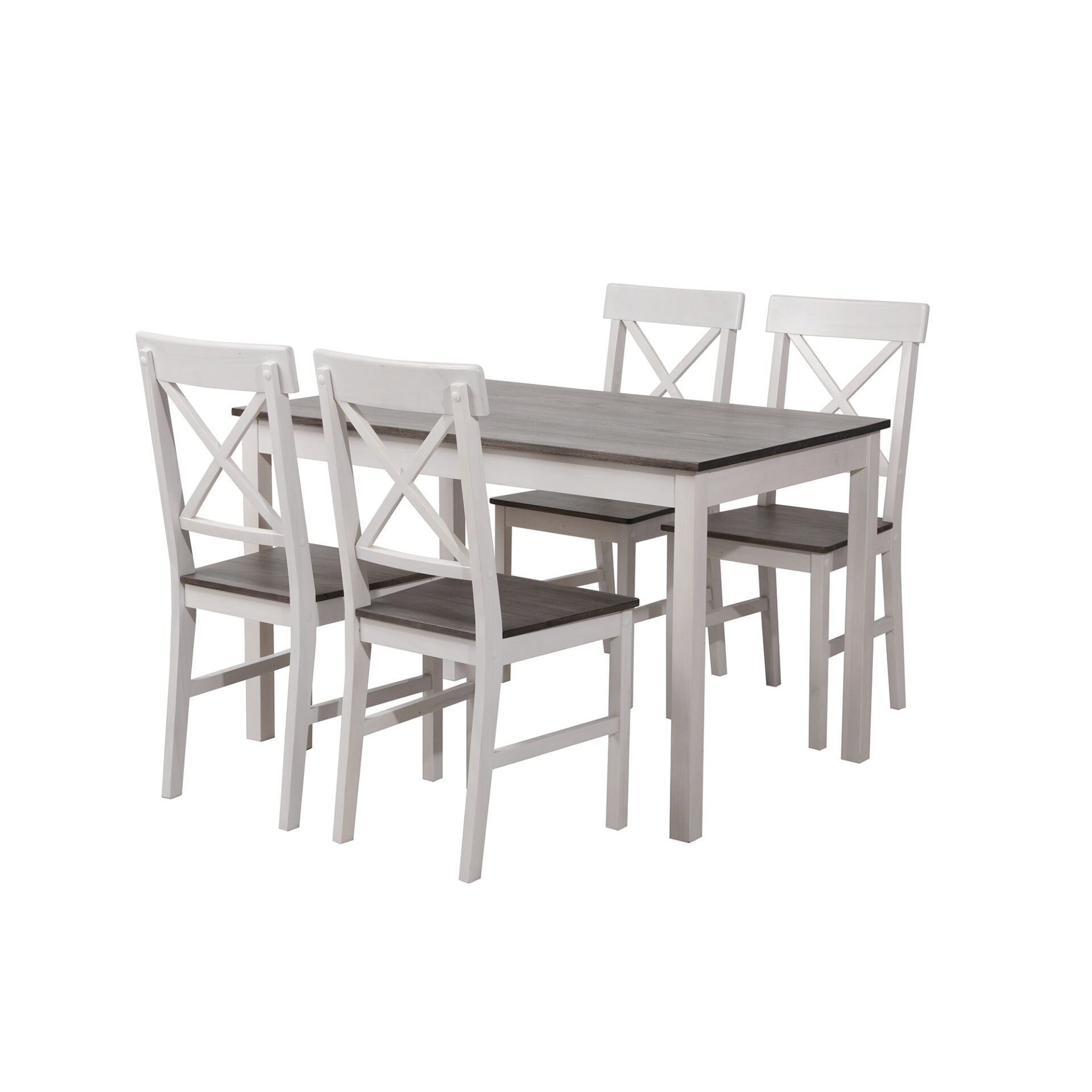 Set composto da: tavolo con struttura in legno gambe bianche e piano fumo. 4 sedie bianche con seduta grigio fumo.